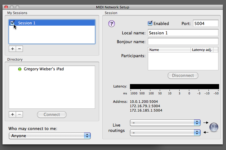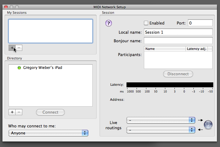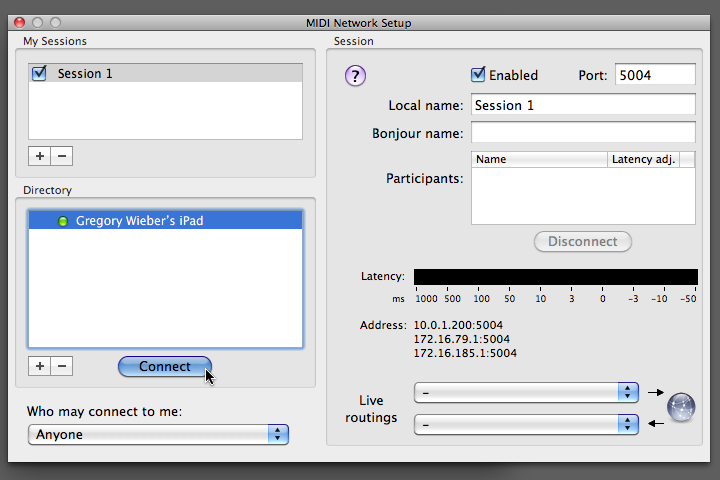 Make sure that polychord is open and running on your iPad. (If it's not, Audio MIDI Setup won't see your iPad.) When you see your iPad's name appear in the 'Directory' pane of the MIDI Network Setup window, select your iPad's name and click the 'connect' button. (If you do not see your iPad, see troubleshooting below)